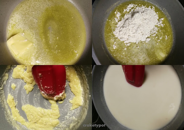 Como veréis esta bechamel además de leche lleva caldo del cocido, lo que la hace más ligera y no apelmaza tanto la harina. Si preferís solo leche, es cuestión de gustos, si las haces sólo con caldo para mi gusto no quedan tan bien, pero en cada casa hay una preferencia.