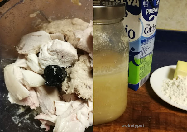 INGREDIENTES: 350 gr de las carnes del cocido incluido el tocino fresco, el rancio no lo ponemos. 600 ml, de caldo de cocido colado, 300 ml, de leche entera, 60 gr. de harina, 60 gr. de mantequilla, nuez moscada, poca sal y pimienta recien molida. Un poco de aceite AOVE.