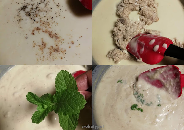 Añadimos la leche y el caldo caliente de golpe y movemos con varillas enérgicamente para que quede sin grumos y procurando que no se pegue. Le ponemos nuez moscada y pimienta recién molida, y la carne. Si os gusta probad con un cogollo de hierbabuena, le da un toque especial.