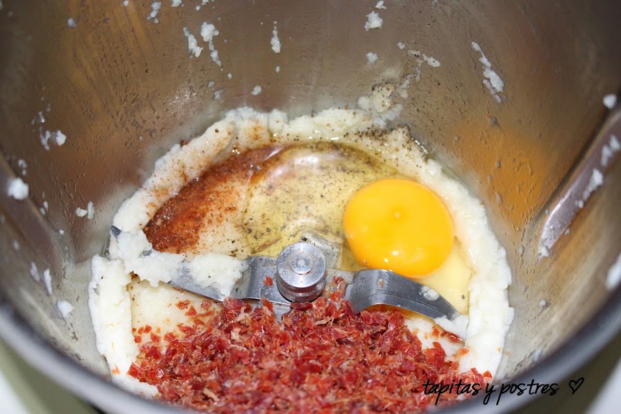 Añadimos el huevo, el jamón picado, un pellizco de pimienta y otro de nuez moscada. Mezclamos 1 minuto a velocidad 2.