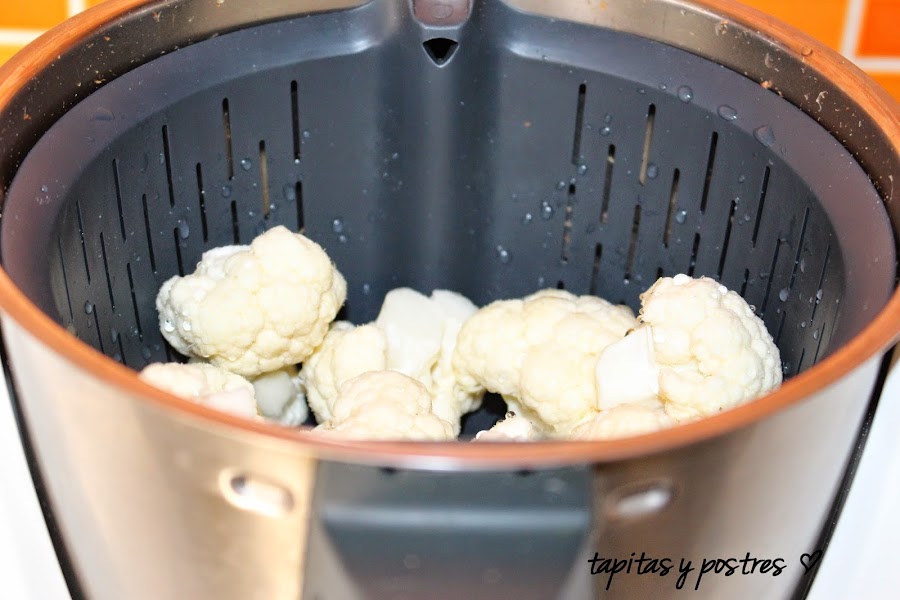 Sin lavar el vaso, echamos ½ litro de agua y colocamos la coliflor lavada y troceada en arbolitos dentro. Programamos 25 minutos, varoma, velocidad 2.