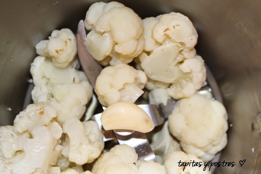 Una vez cocida y tierna, lavamos el vaso y ponemos la coliflor, el aceite y un diente de ajo y lo trituramos todo.