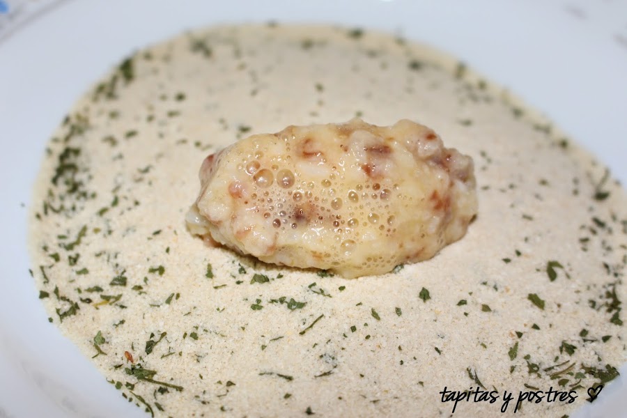 Colocar esta mezcla en un bol y coger porciones, pasar por huevo batido, por pan rallado y freir en abundante aceite.