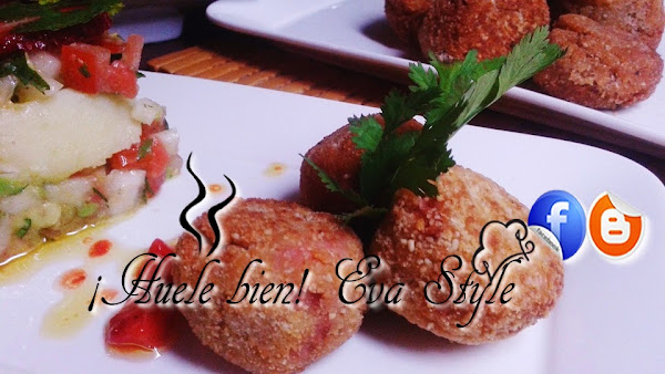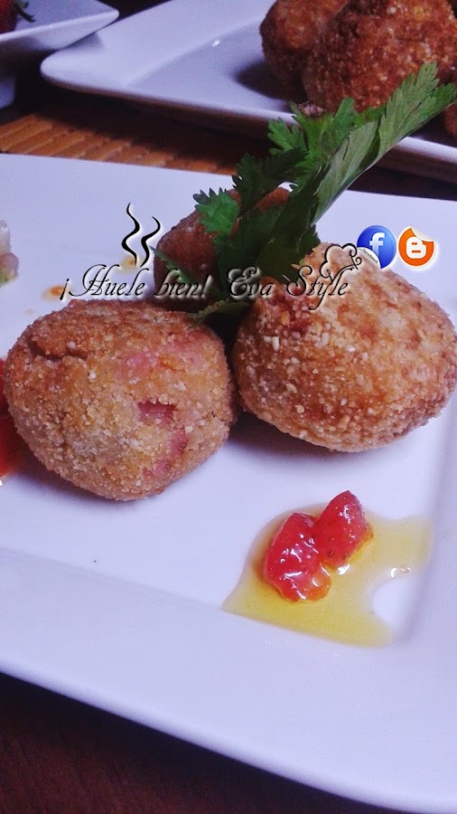 4.- Hacemos las croquetas, cogemos porciones de masa con las manos y hacemos bolitas. Las pasamos por el huevo batido y pan rallado mezclado con 50 gr de almendras molidas. Las freimos en abundante aceite caliente, les quitamos el aceite sobrante sobre el papel de cocina.