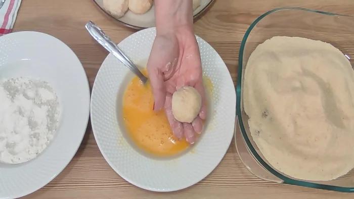 Rebozaremos las croquetas pasándolas por harina, huevo batido y pan rallado.