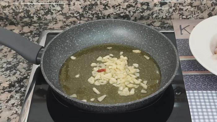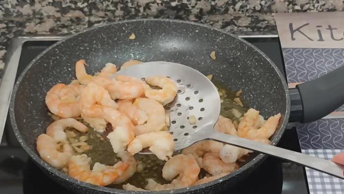 1 Comenzaremos poniendo a calentar en una sartén 75 ml de aceite. Cuando el aceite haya adquirido temperatura, incorporaremos unos dientes de ajo laminados y una pimienta cayena o guindilla. Salteamos a fuego suave, durante unos minutos.Cuando los ajos vayan a empezar a dorarse, añadimos a la sartén gambas, gambones o langostinos pelados. Los salamos y, a temperatura baja, los cocinamos un poco, no mucho, en cuanto veamos que han cambiado de color, debemos retirarlos del fuego.