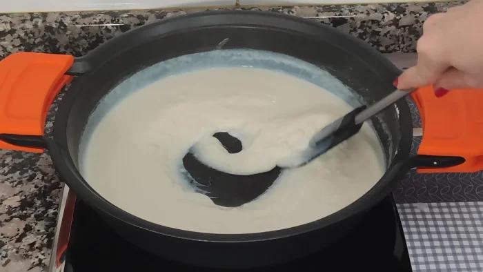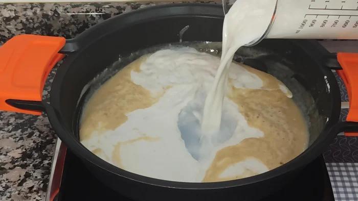 Removeremos bien durante un par de minutitos hasta que ambas se integren y la harina se cocine ligeramente sin tostarse. En este punto, iremos añadiendo leche, de poco en poco, con el fuego a baja temperatura.