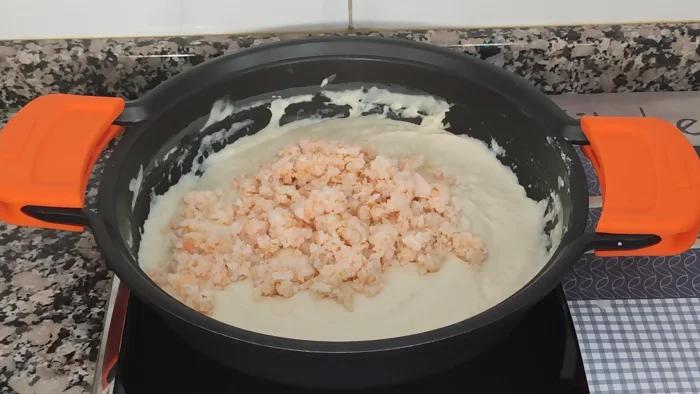 Cuando la bechamel esté prácticamente ligada, le agregaremos sal , una pizca de nuez moscada y, como no, las gambas al ajillo que habíamos reservado anteriormente y que habremos troceado a nuestro gusto.