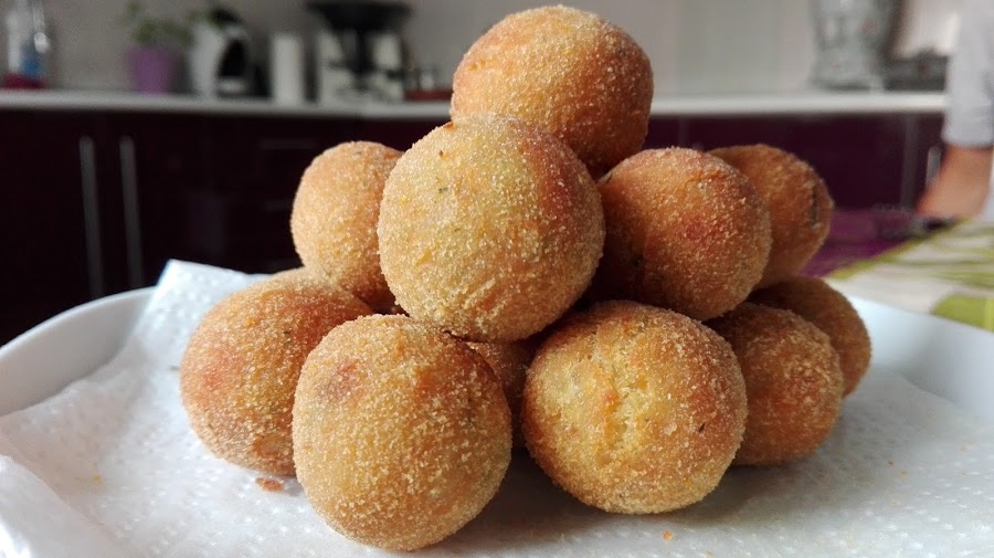 Una vez pasado el tiempo, le añadimos pan rallado, lo que ayudará a que la masa no esté tan pegajosa y a poder manejarla sin que se nos pegue. Hacemos bolas, las pasamos por huevo y por pan rallado y listas para freir!