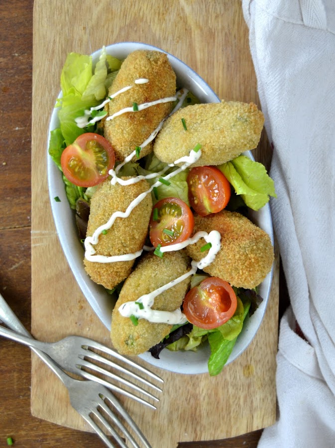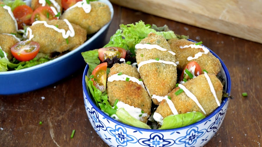 7.- Servimos los croquetas con la guarnición que más nos guste. En nuestro caso con un poco de ensalada, uno tomatitos y salsa de yogur con ajo