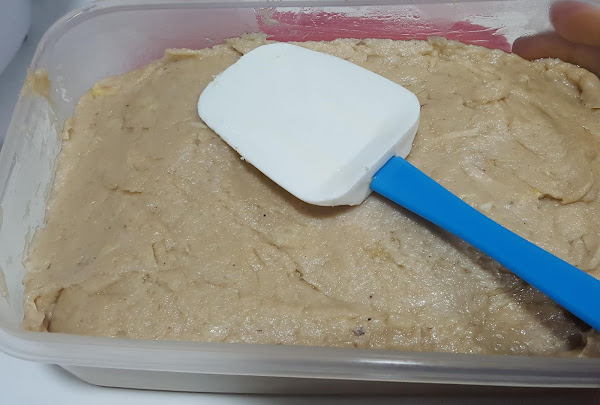 6.- Terminada la bechamel añadimos el resto de la picada y mezclamos con la espátula. Vertemos la masa en un recipiente con tapa y dejamos enfriar.