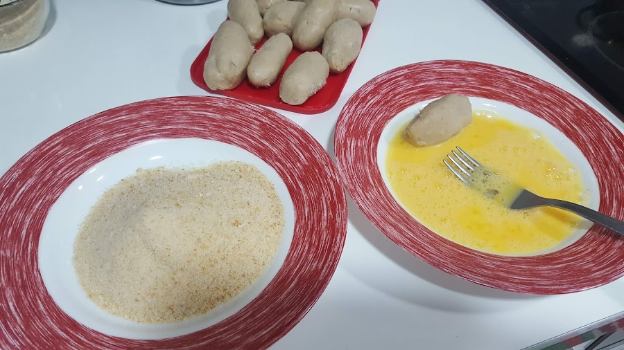 7.- Una vez frías les podemos dar forma, para después rebozar en huevo y pan rallado y freír en una sartén con abundante aceite o en freidora. Una vez hechas, no os olvidéis ponerlas en un plato o bandeja con papel de cocina, para que absorba el aceite que sueltan y no queden aceitosas.