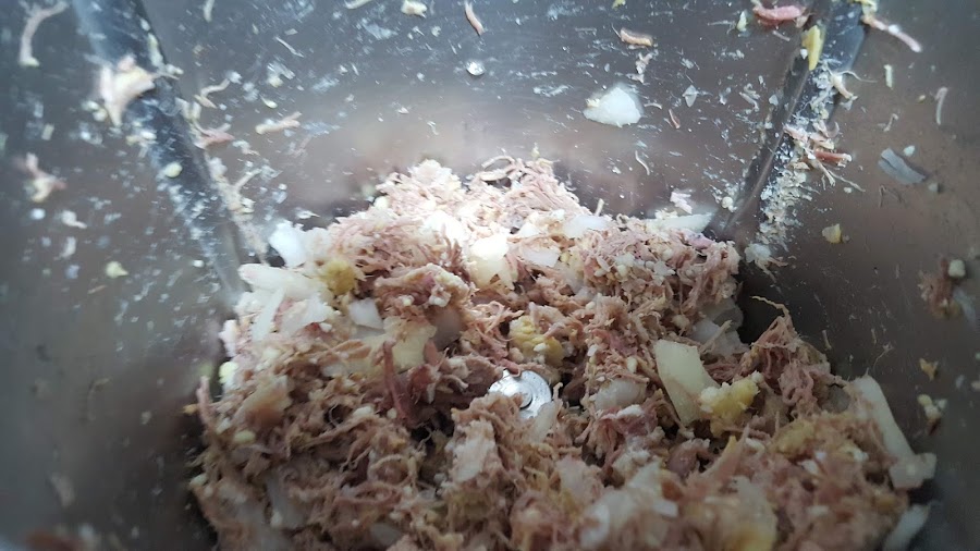 1.- En el vaso de la thermomix echamos la garreta y trituramos 10 segundos, velocidad 5. Si vemos que no está bien picada, le damos un golpe de turbo de un minuto. Reservamos la picada en un bol.