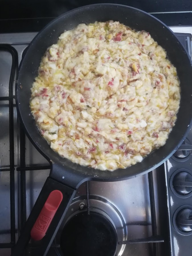 Paso 3: En este punto le añadimos los huevos que ya tenemos fritos y reservados y que también habremos picado. Mezclamos bien con la espátula y dejamos de nuevo 2 minutos para que todos los ingredientes se integren bien.
