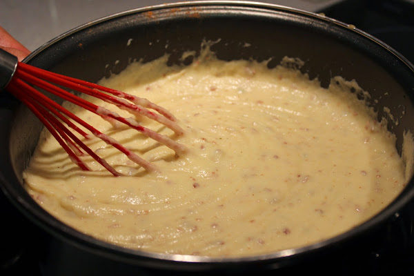 Ahora echamos, la nuez moscada, la pimienta negra, el jamón y los quesos, si hace falta añadimos un poquito de sal y seguimos moviendo.