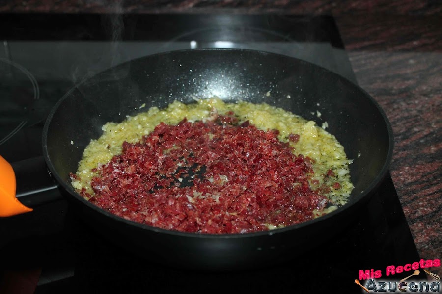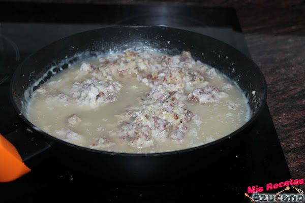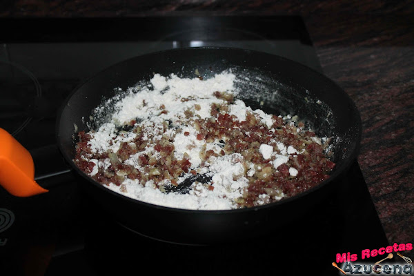Pasado ese tiempo añadimos el jamón, removemos todo y lo sofreiremos 2 minutos, para poder añadir la harina, removemos todo y volvemos a dejar otros 2 minutos más sofriendo la harina para quitarle el sabor a harina cruda, durante estos minutos estaremos removiéndola.