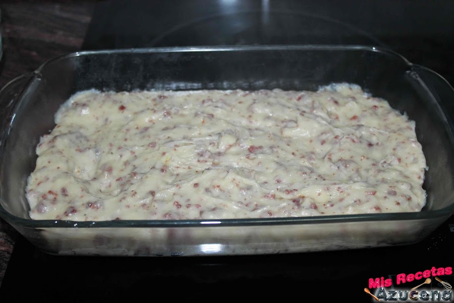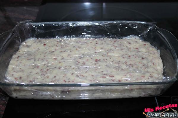 Una vez colocada en la bandeja y para que no nos crie costra la masa la cubriremos con film transparente pero este tiene que estar tocando la masa.