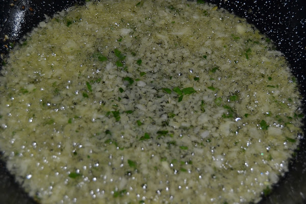 En un perol echamos el aceite y ponemos a pochar la cebolla, los ajos y el perejil con un poco de sal.