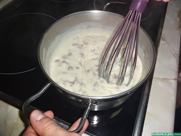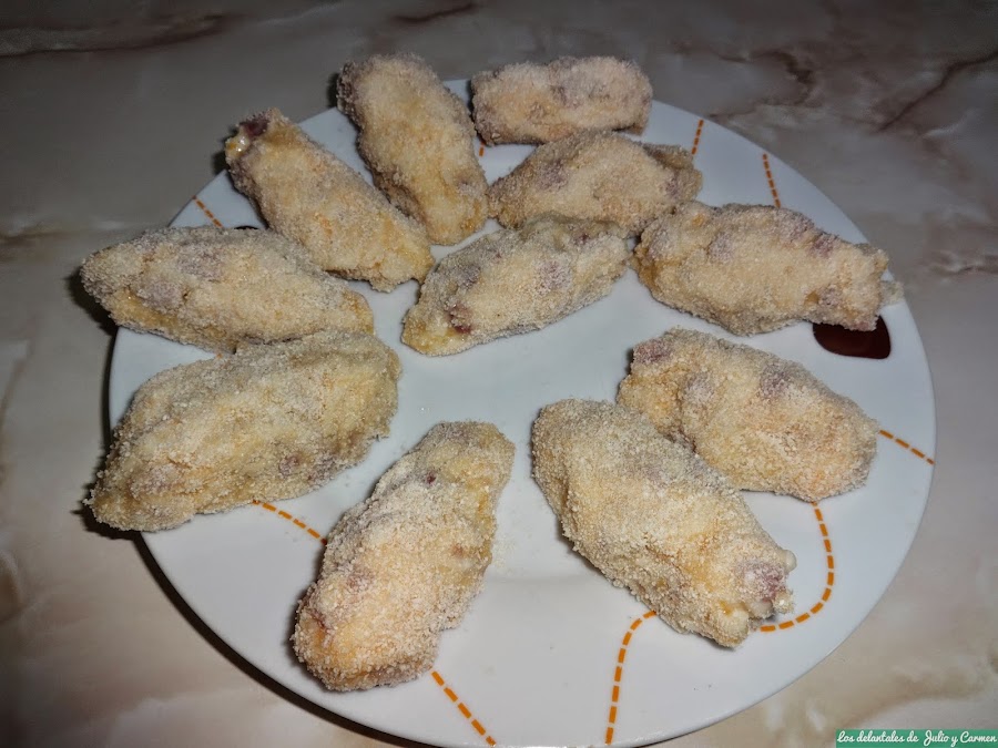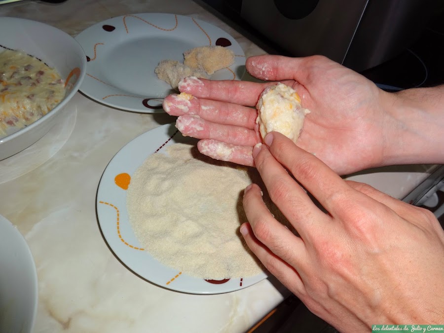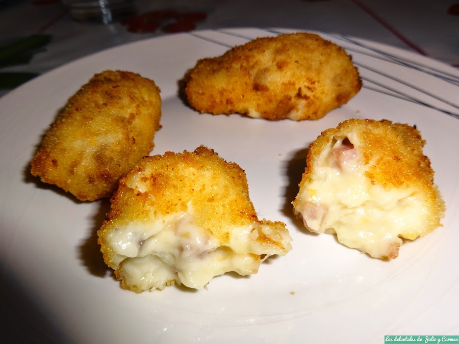Fue verla y pensar: este mismo sábado las preparo. Y dicho y hecho. Nos lanzamos a la aventura: preparamos la bechamel sin ningún tipo de complicación, añadimos los ingredientes, dejamos la masa reposar... y el plato quedó increíble. Sabrosas, muy cremosas y crujientes, con la mezcla de los quesos y los trozos grandes del jamón. Quedamos muy contentos con el resultado, y a consecuencia de ello, las hemos vuelto a preparar mas veces, siempre con el mismo resultado.