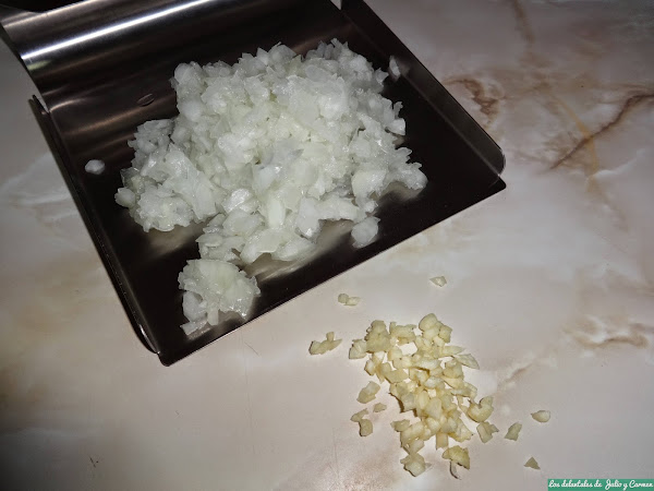 Picaremos muy finamente tanto la cebolla como el diente de ajo y lo llevaremos a una sarten con un chorro de aceite, y a fuego bajo, lo pocharemos lentamente hasta que esté transparente la cebolla.