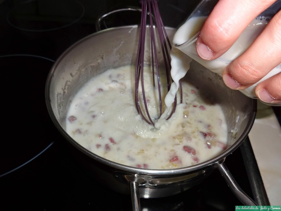 Cuando la harina esté, verteremos la leche templada (si es necesario, la calentaremos un poco en el microondas) poco a poco y sin dejar de remover.