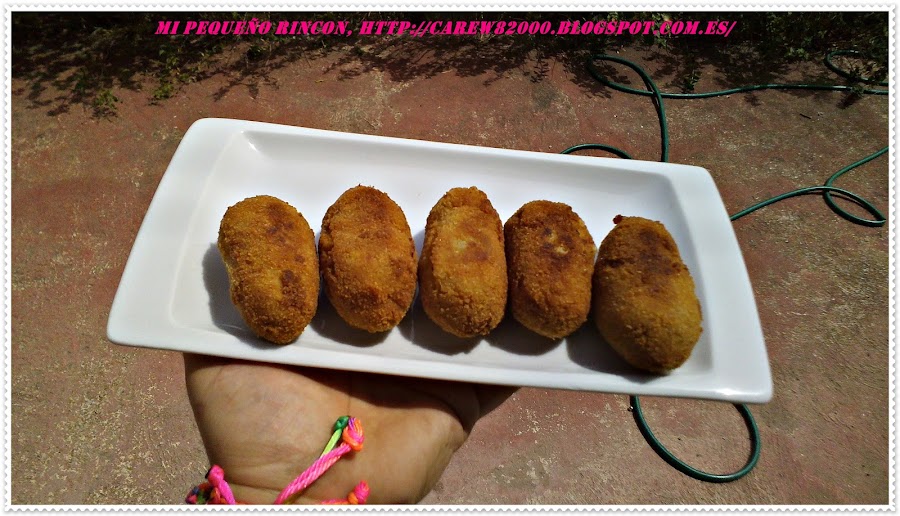 envuelta en papel transparente unos minutos, mientras preparamos un par de platos para el pan rallado y otro para la yema de huevo. Hacemos pequeñas bolas con la masa y las vamos pasando por el pan rallado y el huevo dándolas forma. Una vez estén todas pasaremos unos minutos por la sartén cada una de las croquetas hasta que queden bien tostaditas y hechas. (Es una gran receta a la cual podemos añadir muchos ingredientes, pollo, espinacas, setas.….)