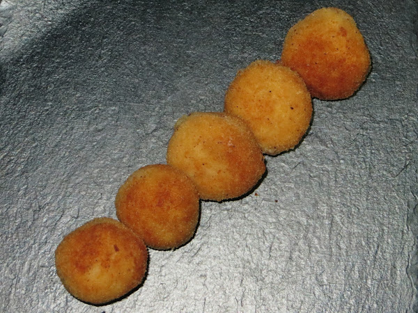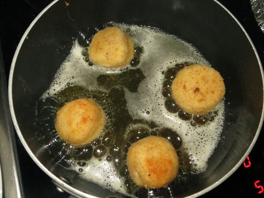 La saque a un plato y la deje enfriar. Luego hice las croquetas y las pasé por pan rallado, huevo y otra vez por pan rallado. Puse aceite de oliva en la sartén y cuando estuvo caliente las fui friendo por ambos lados y ya están listas para servir.