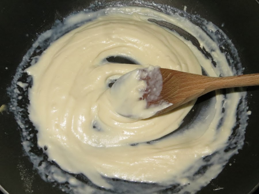 Echamos unas cuantas cucharadas de aceite en la sartén y añadimos la harina de trigo para que se cocine luego poco a poco vamos añadiendo la leche y le damos vueltas con una cucharada de madera para que se nos haga la bechamel. No dejéis de darle vueltas, ya que si no se os pueden formar grumos. Una vez que la bechamel se despegue de las paredes de la sartén significará que ya está lista.