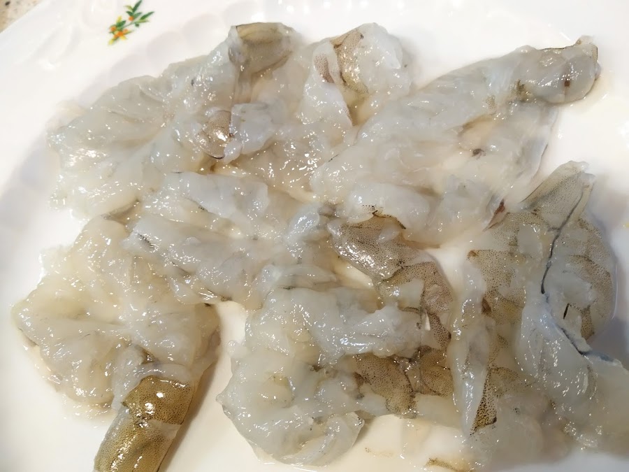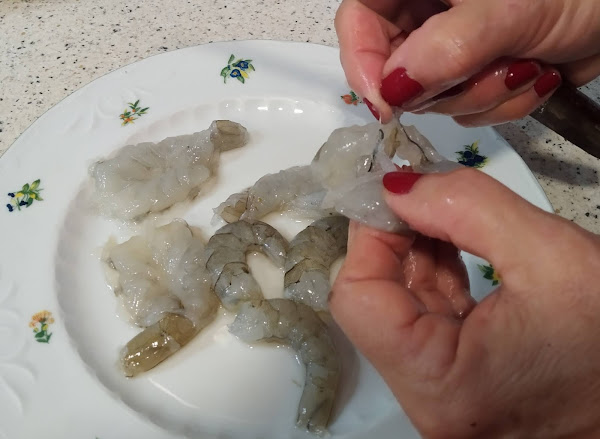 Pelar los langostinos y reservar la carne las cabezas y piel por separado. Quitar con sumo cuidado ambos intestinos de los langostinos.