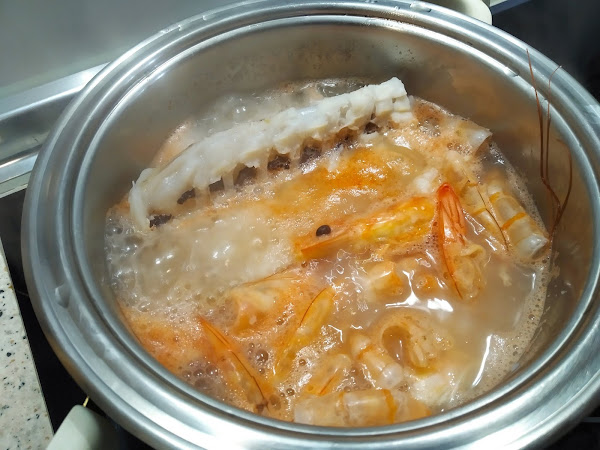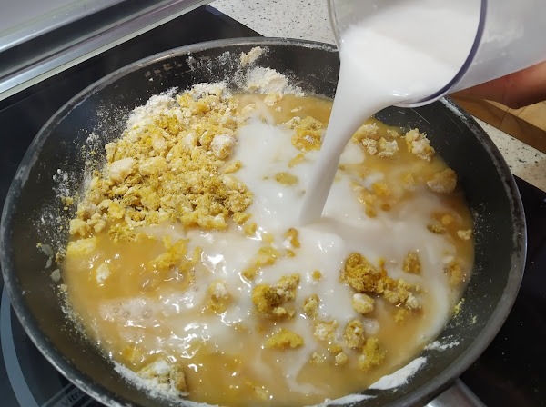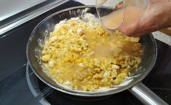 Echar la harina y el curry mezclar bien con el resto de los ingredientes durante un minuto, añadiendo sin dejar de remover a fin de que no se hagan grumos, el caldo de los langostinos y la leche de coco. Salar al gusto.