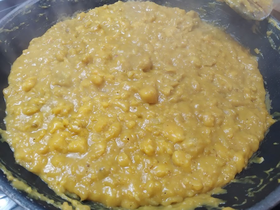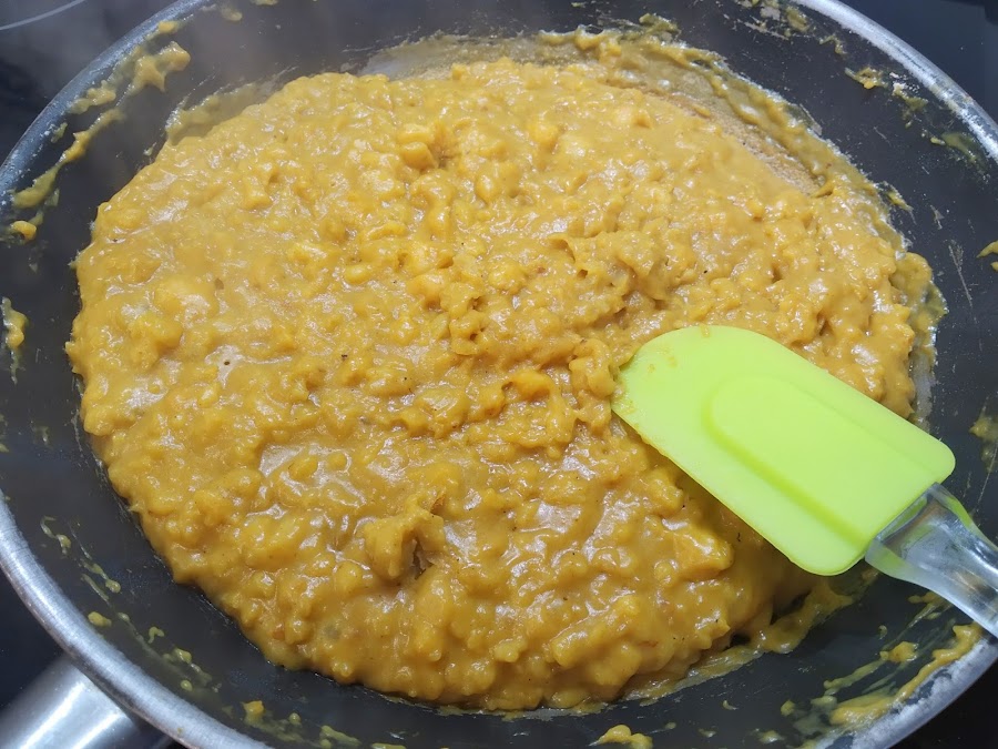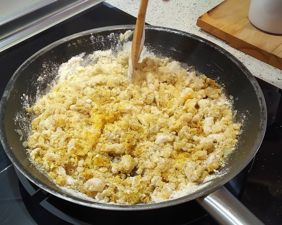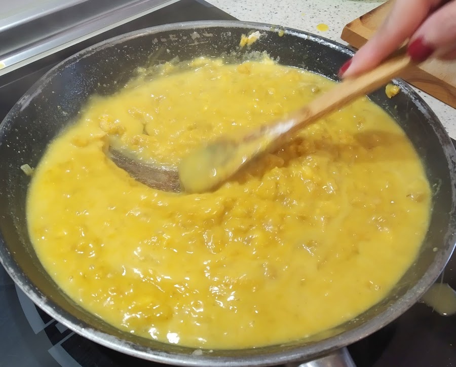 Remover continuamente, hasta que se despegue de las paredes de la sartén, procurando siempre que no se pegue, ni se queme la masa. Hay que procurar que queden ni muy espesa, ni demasiado clara.