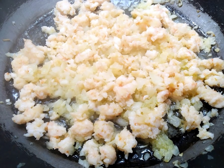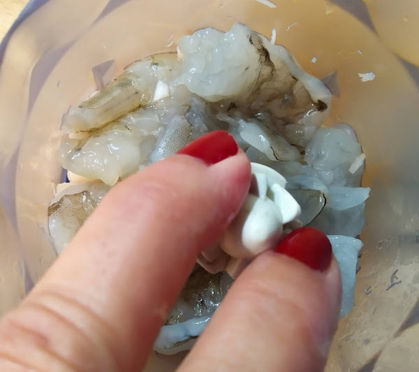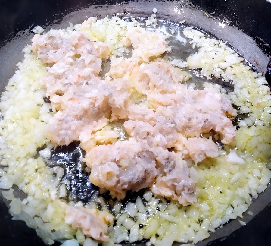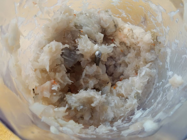 En una picadora (si no tienen pueden hacerlo con la batidora) picar los langostinos junto con los trozos de rosada, a máxima potencia de forma que queden una masa no demasiado fina, pero con cuidado de que no queden tropezones demasiado gruesos.