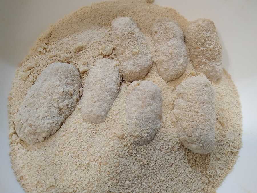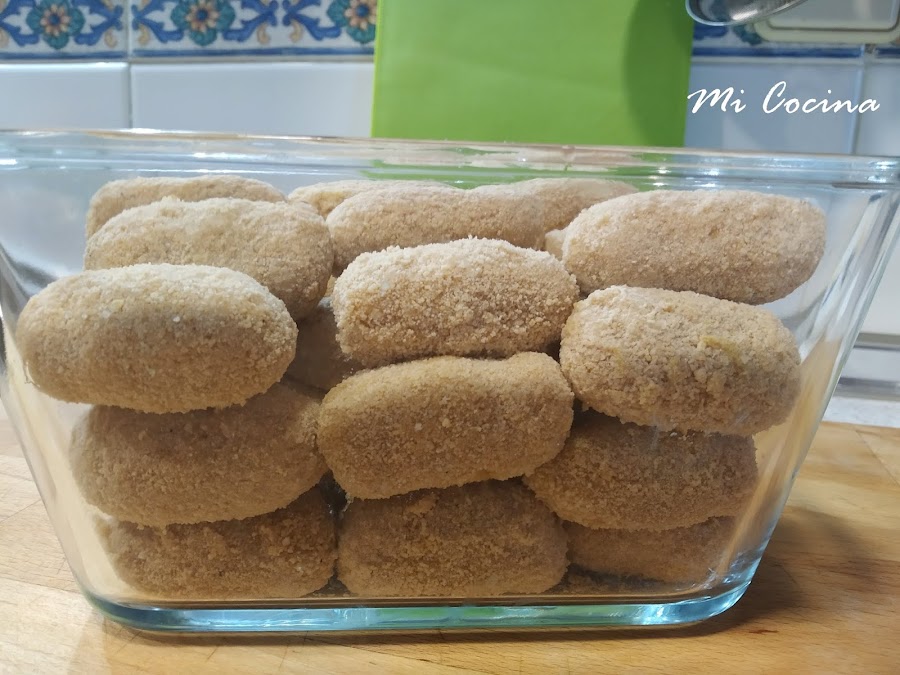 Cogerlas una a una, escurriendo y pasándolas al cuenco de pan rallado, haciendo movimientos envolventes con cierta “energía”, de forma que irán rozando unas contra otras quedando el pan rallado bien adherido, lisas y redondeadas.