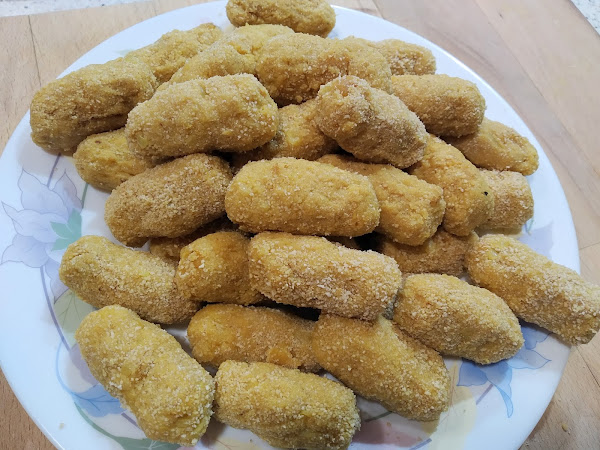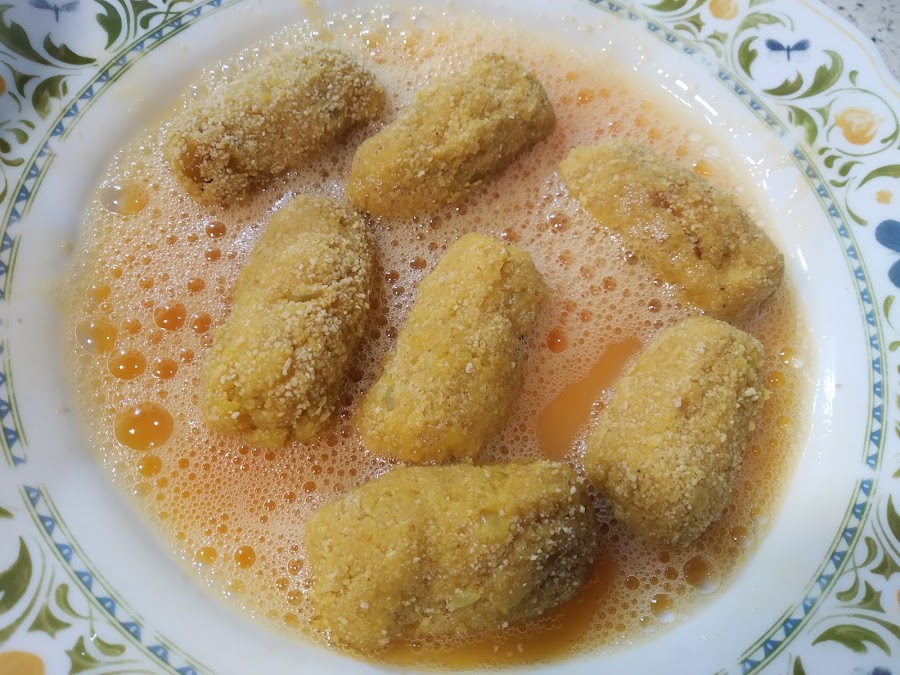(En ocasiones, sobre todo si me sobra huevo, suelo hacer un “doble rebozado”, pasándolas nuevamente por huevo y pan rallado, dándoles una mayor consistencia a la croqueta).