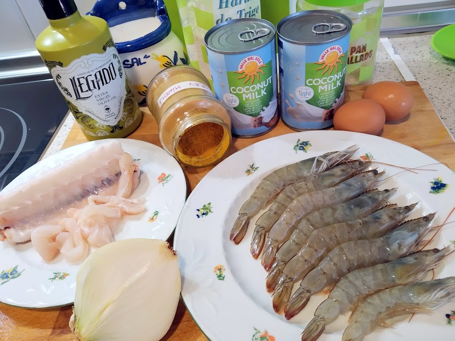 8 langostinos jumbo, 50 grms. de rosada (y la espina de la rosada), media cebolla blanca dulce (tipo cebolleta), dos vasos de agua, seis cucharadas soperas de aceite de oliva virgen extra, dos vasos medianos de harina de trigo, cuatro cucharadas soperas de curry de madrás (en su defecto curry amarillo que pueden encontrar en cualquier superficie, sobre todo si no gusta el picante), dos vasos de leche de coco, sal, dos huevos, aceite de oliva para freir y pan rallado.
