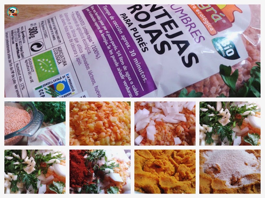 1.- Ponemos a cocer las lentejas en agua hirviendo, sal y hoja hoja de laurel, durante 30 minutos. Las escurrimos bien, dejamos enfriar. En un bol ponemos las lentejas con el cebolla y los ajos pelados y picados, añadimos el jengibre pelado y cortado en trozos, el cilantro, la cúrcuma, el pimentón, la sal y la pimienta molida. Lo trituramos todo con el brozo de la batidora, dejamos reposar 30 minutos en la nevera.
