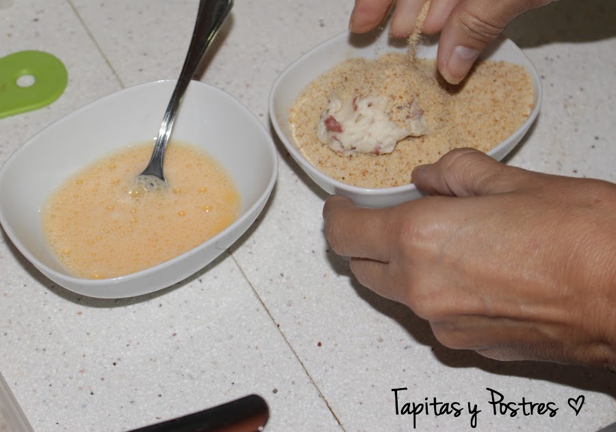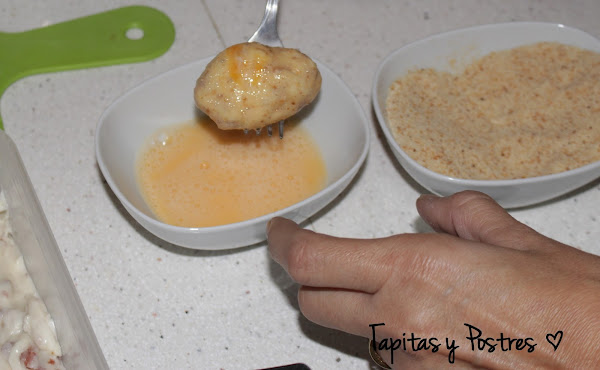 Cogemos porciones, damos forma de croqueta y pasamos por pan rallado, huevo batido y otra vez pan rallado. Freímos en abundante aceite caliente.