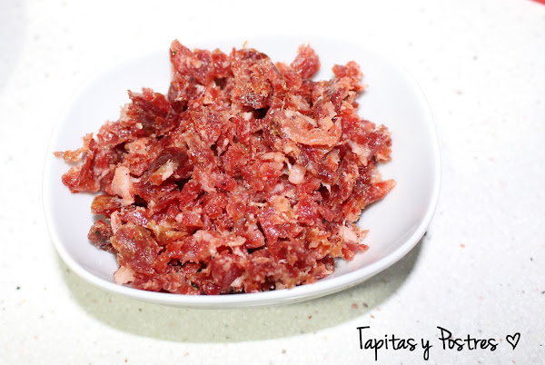 Picamos la longaniza con una picadora o con un cuchillo, dejamos trozos muy pequeños. Reservamos.