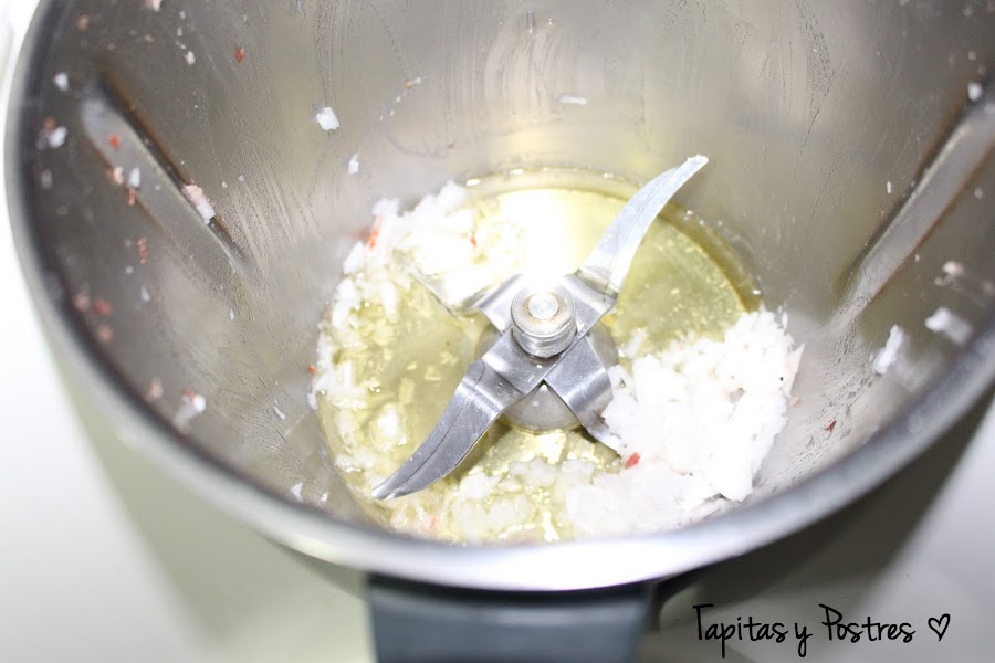 Ponemos la cebolla en el vaso y picamos un segundo a velocidad 4. Agregamos el aceite y sofreímos tres minutos, a temperatura Varoma y velocidad 3 1/2.