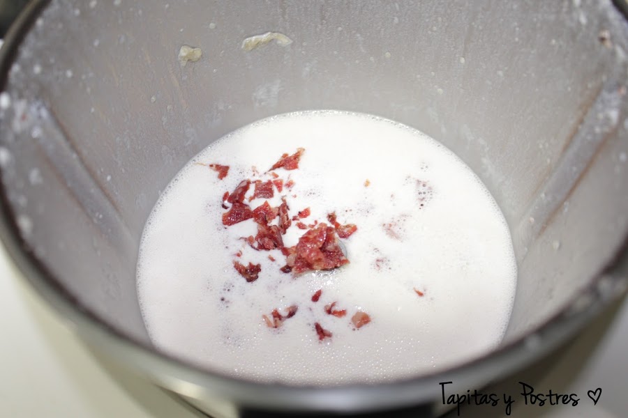 Primero vamos a picar la longaniza, poniéndola en el vaso 5 segundos a velocidad 6. Que nos queden trocitos muy pequeños. Sacamos y reservamos.