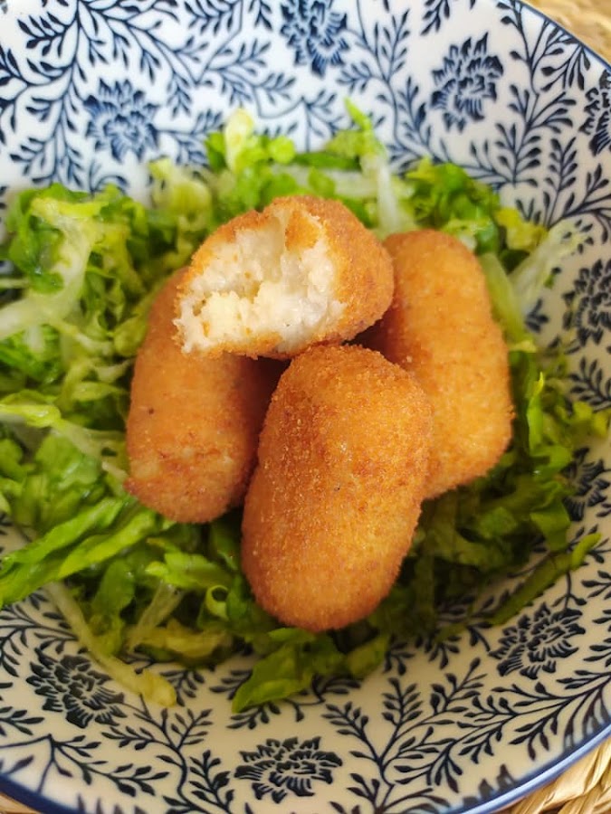Sacamos la masa de la nevera y le vamos dando forma de croqueta, directamente pasamos por pan rallado sin alérgenos.
