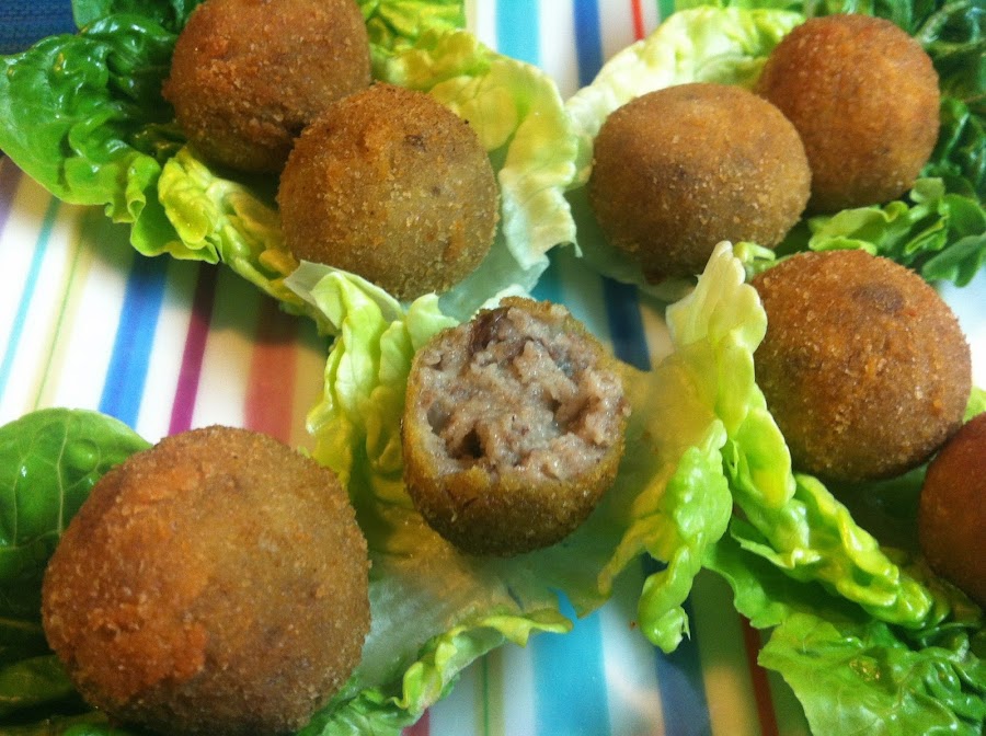 Con la masa fría se moldean las croquetas, en este caso en forma de bolitas, se pasan por harina, huevo batido y, por último, por pan rallado.