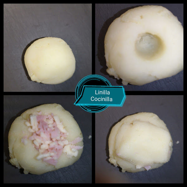 4. Haga una bola con una porción de puré de patata. Con el dedo, haga un agujero, introduzca 1/2 cucharadita del relleno y cierre el agujero con puré de patata. Repita la operación hasta formar todas las croquetas.