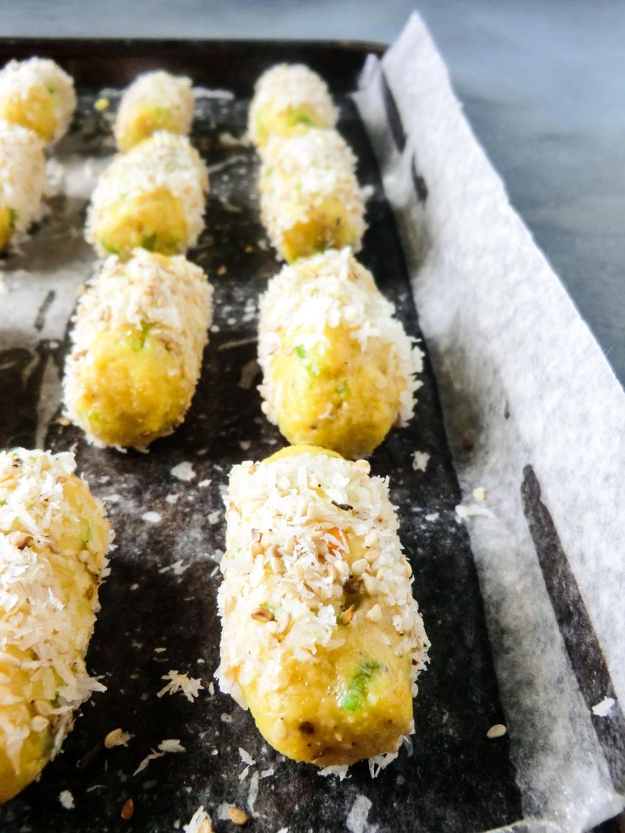 Batir la clara de huevo y pasar las croquetas por ella, escurrir y pasar ligeramente por la mezcla de coco y semillas de ajonjolí. No debe quedar un empanado muy grueso , solo una capa ligera.