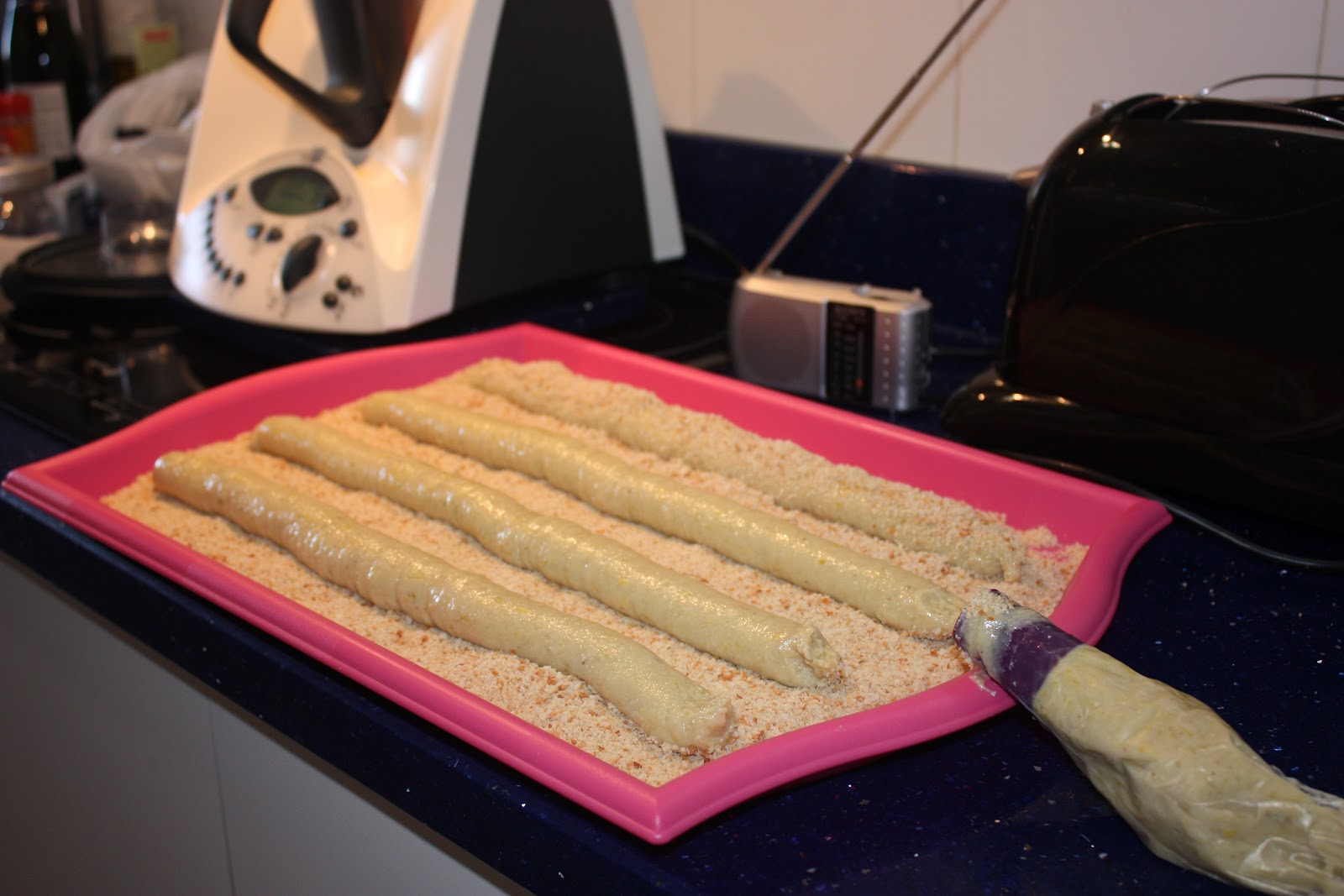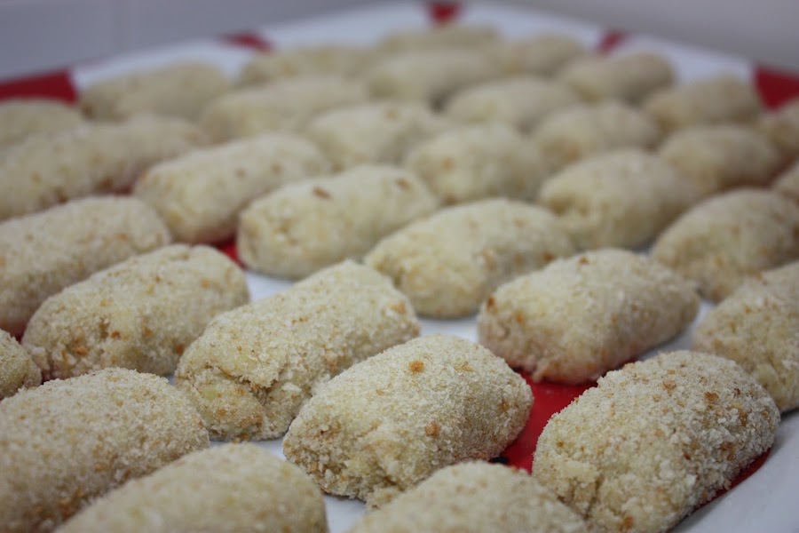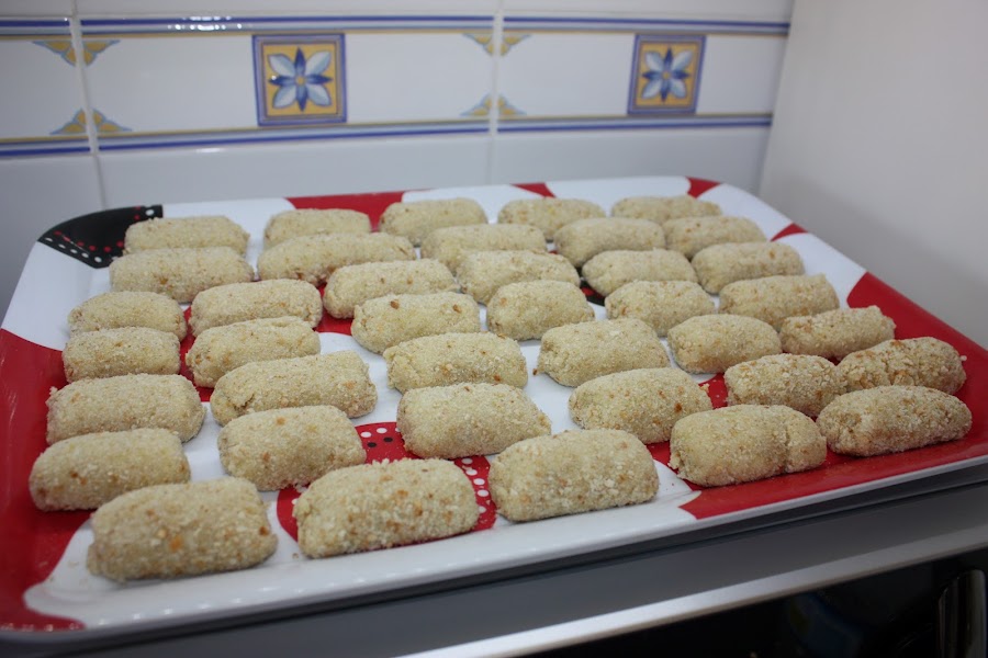 En una bandeja ponemos el pan rallado y con la manga pastelera hacemos una supercroqueta todo el largo de la bandeja.