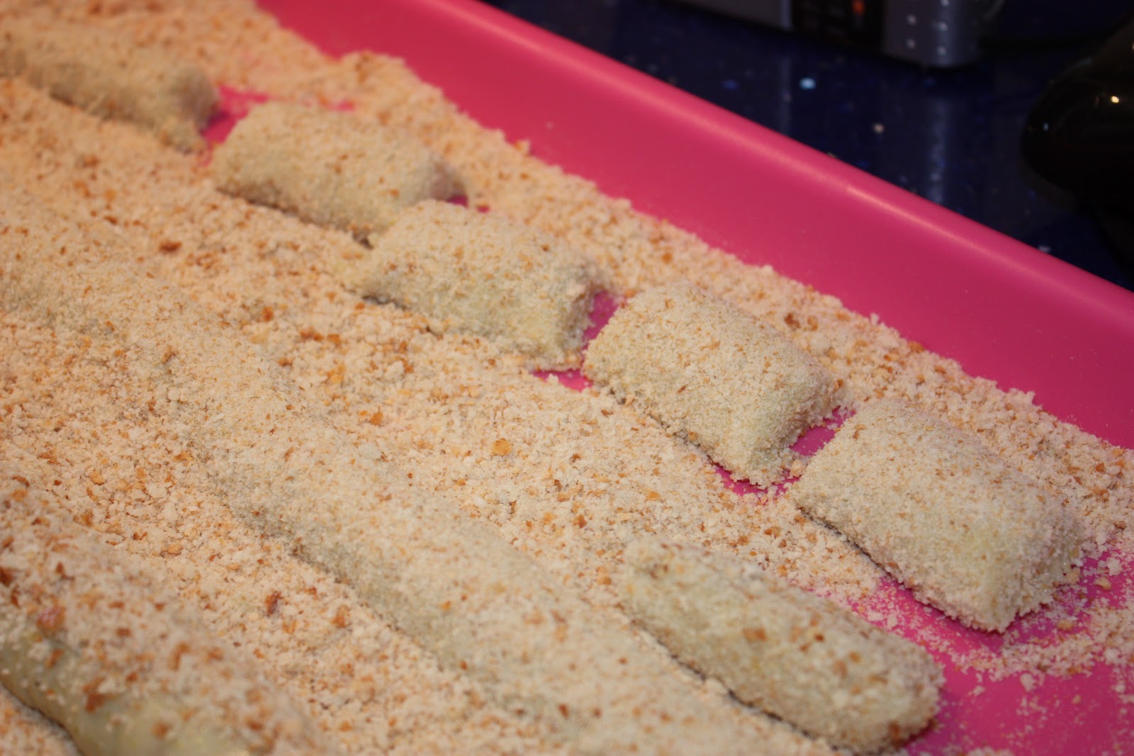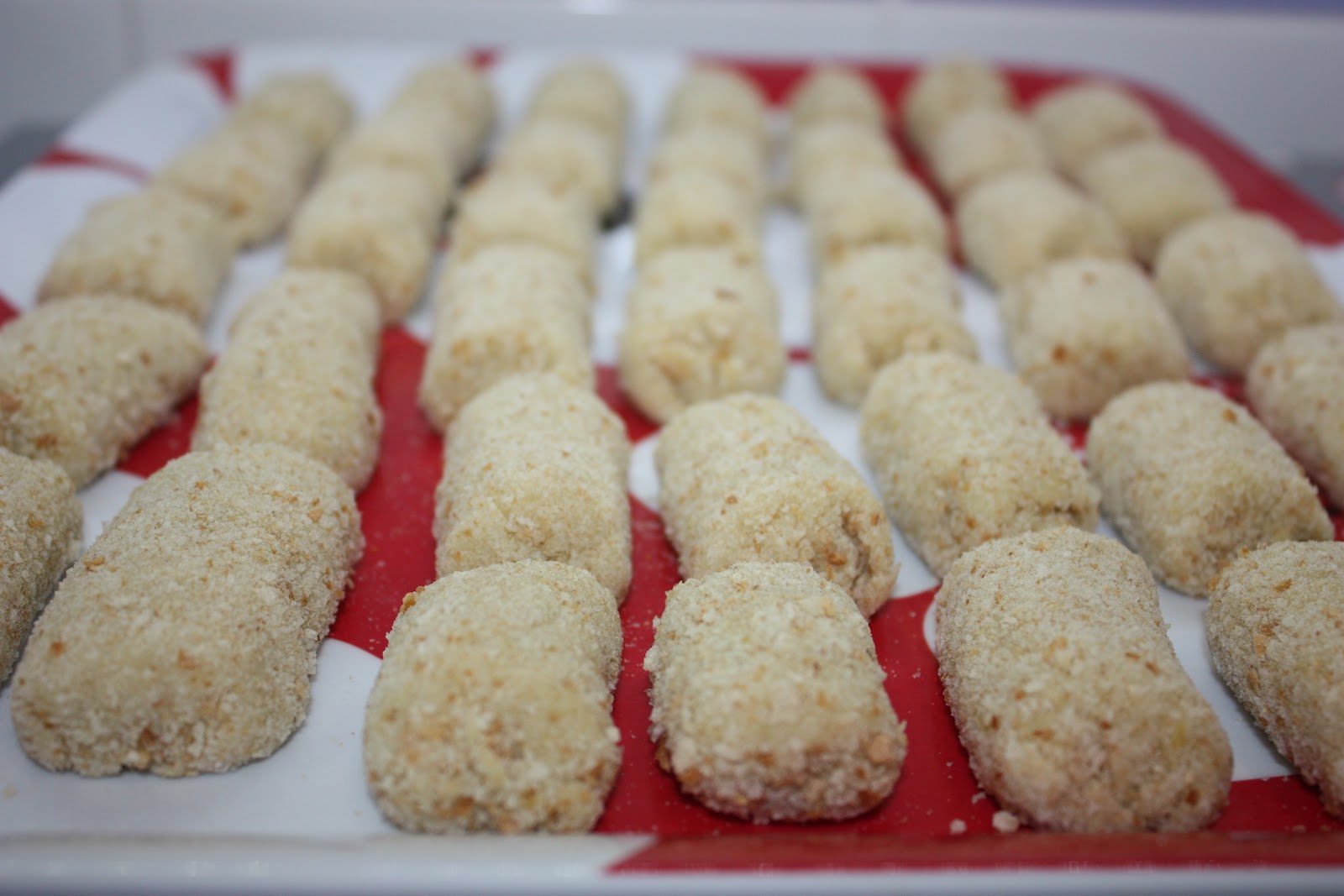 Una vez cortadas nos aseguramos que estén bien rebozadas , por los extremos también , y las pasamos a otra bandeja.