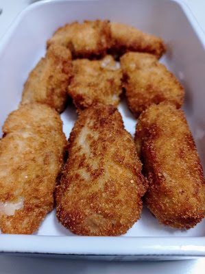 Le damos forma a las croquetas y pasamos directamente por pan rallado, freímos en aceite de oliva.