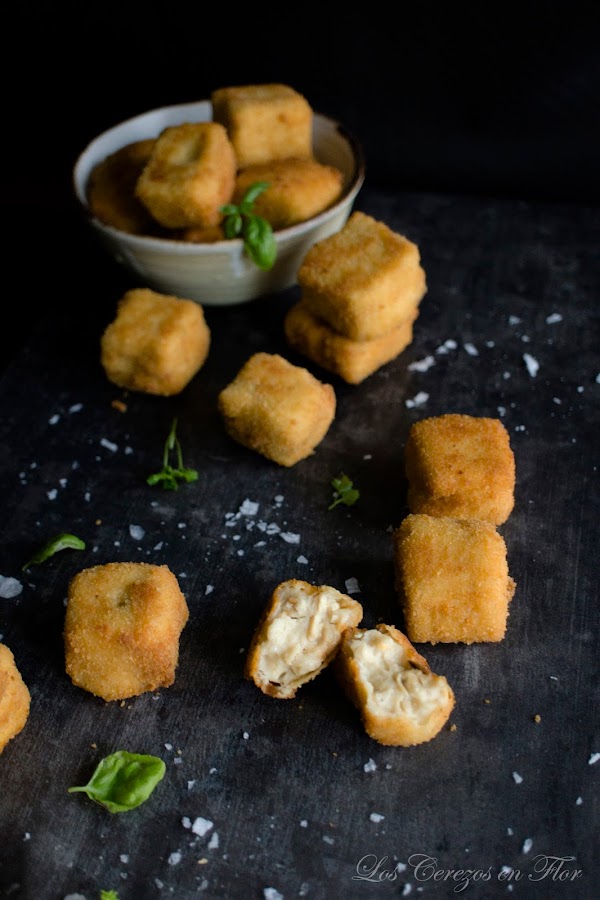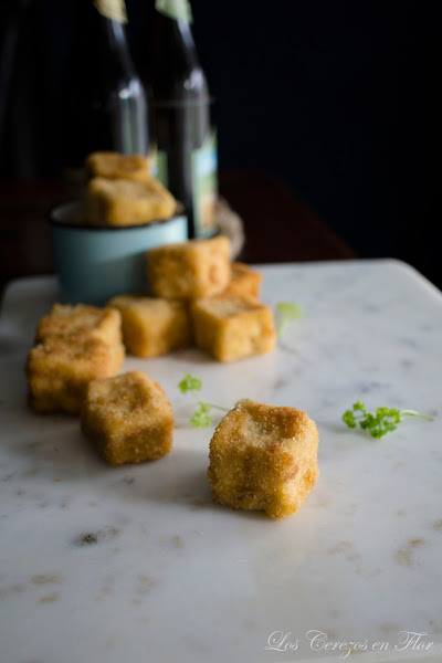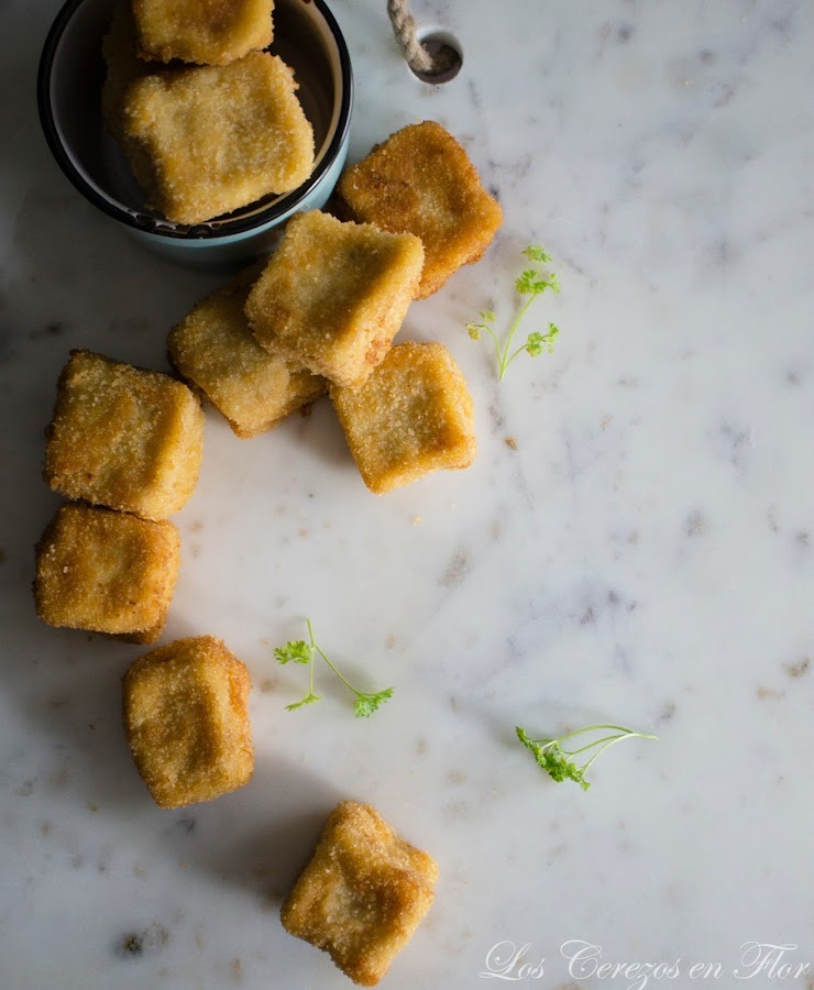 3. Dar forma a las croquetas, en mi caso cuadradas. Meter de nuevo en el frigorífico durante 3 horas. Pasado el tiempo, las enharinamos ligeramente, las pasamos por huevo escurriendo el exceso y por último por pan rallado. Freír en abundante aceite a 180°C sin amontonarlas hasta dorar. Escurrir el exceso de aceite en un plato cubierto con papel de cocina. Servir inmediatamente.