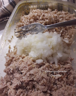 Moldeamos las croquetas, yo las hago con dos cucharas, se pasan por el huevo primero y después por el pan rallado, ayudándonos con las manos...