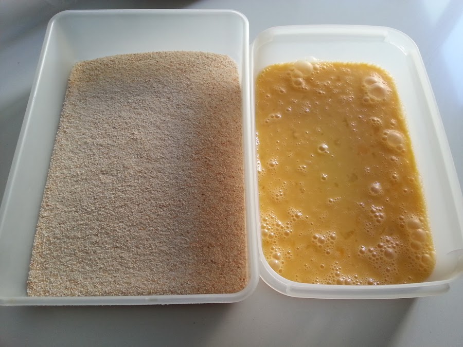 6. - Ponemos una fuente o lo que os venga mejor, con pan rallado y otro con los huevos batidos.